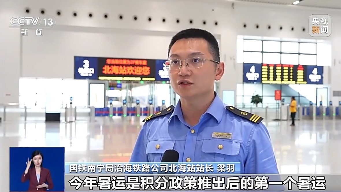 国铁南宁局沿海铁路公司北海站站长 梁羽:今年暑运是积分政策推出后的第一个暑运。年满60周岁的常旅客会员乘坐旅客列车时将获得票面金额15倍的积分,相当于普通常旅客会员的3倍,比如说花费1000元乘坐火车,可获赠1.5万积分,兑换火车票时可抵150元使用。